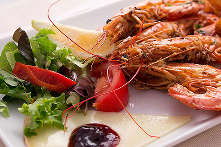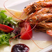Assiette de la merCrevettes et rougets avec riz et sa sauce orientale ou pommes de terre coriandre.