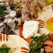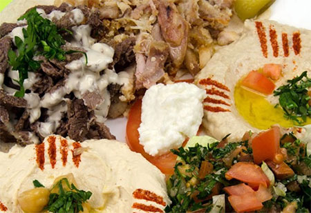 CHAWARMAViande marinée, émincée, rôtie à la broche avec hommos.