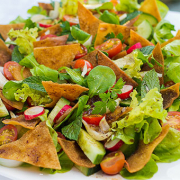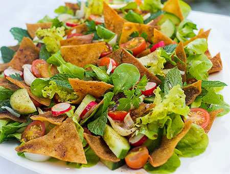 FATTOUCHESalade de crudités fraîches (pourpier, salade verte, tomates, concombres, radis, oignons, poivrons, menthe, persil …). Elle est assaisonnée avec du jus de citron de l’huile d’olive et du sumac (épice acidulé). On consomme le fattouche traditionnellement avec du pain pita grillé. Une salade délicieuse et très rafraîchissante !