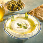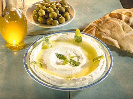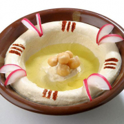 HOUMOUSSpécialité libanaise, purée de pois chiches à la crème de sésames (tahini), on la sert avec des légumes crus et du pain pita.