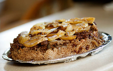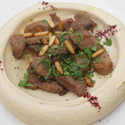 HOMMOS BIL LAHMEPurée de pois chiches avec de l’agneau aux épices.