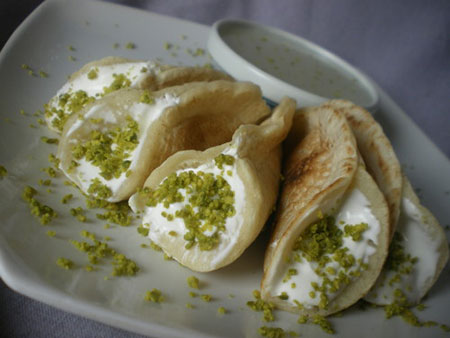 KATAYEF à la crème de laitLes Katayefs peuvent être aussi servis sous forme de chausson, fourré de achta. Alors une explication s’impose pour cette fameuse crème, « el Achta » : c’est une simple crème de lait parfumée ou non à l’eau de fleur d’oranger. On l’utilise pour plusieurs desserts de la cuisine libanaise : Achtaliyé, Ayef saraya, basma bi achta madet achta, etc..
