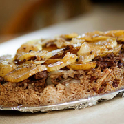 MAKLOUBEHPoulet, riz, amandes, aubergines, sauce orientale.