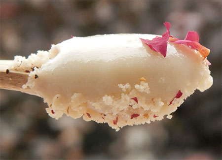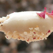 MOUHALABIÉFlan à la fleur d’oranger surmonté d’éclat de pistache fraiche non salée.