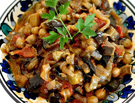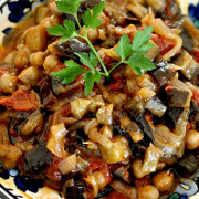 MOUSSAKAAubergines cuisinées à la sauce tomate et pois chiches.