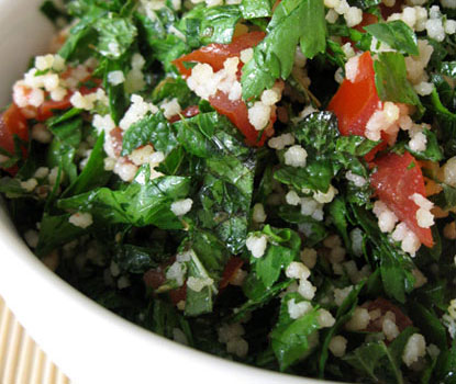 TABOULÉPersil, tomates, menthe, blé concassé, oignons, citron et huile d’olive.